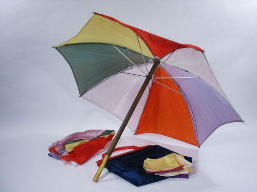 Showing a parasol and opening it giving it a twirl the magician closes it and rolls it within a tube of paper. Handing the parasol off to his assistant he then takes a ladies handbag and from it removes several silks. Showing the silks he replaces them in the handbag and makes a magical pass. Opening the handbag the magician withdraws the cover of the parasol! Setting this aside he goes to the assistant holding the rolled up parasol and removes the parasol from its covering. Opening the parasol and giving it a twirl it is seen that the parasol is nothing but the ribs minus the cover but tied to each rib end is a silk shown moments before that had been placed in the handbag! A reversal of the process is done putting everything back the way it should be. Keep in mind the handle of the parasol is in view the entire time. The complete effect with parasol, 12 silks and handbag and parasol cover. Very well made to withstand a busy performance schedule. This is one effect that still mystifies and entertains today. Includes 2 pages of instructions and in very fine condition.