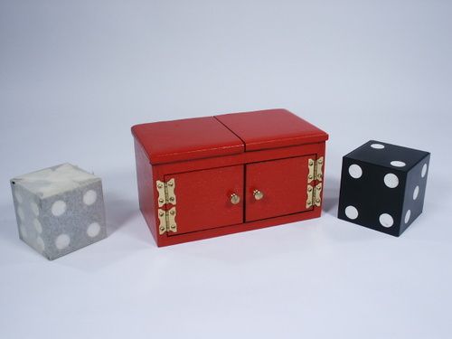 In new never used condition with solid wood die still wrapped in tissue. Made of solid wood with brass hardware and measures 6 1/2" wide x 3 3/8" high x 3 3/8" deep with a 2 1/4" size die. If you had one of these as a budding young magician and lost track of it then now you may recapture those memories by having this one. Includes instructions.