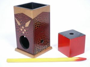 A mechanical apparatus that should delight made of wood with a lovely finish and hallmark stamped. A 2 3/8" block represents a vampire and the tube referred to as the coffin is shown and the block placed in the coffin. The wood stake can be run through the side walls of the coffin and through the center or heart of the vampire locking the vampire in place. The vampire is clearly seen in a large opening at the front. Even though locked in place with the stake the vampire visibly escapes leaving the stake still in place and seen by the opening at the front! Hard to find and in very fine condition. | |