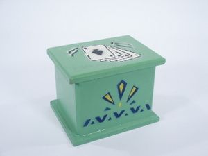 An idea by Clint Riedel where selected cards shuffled back into a deck and placed into the chest will rise mysteriously with the lid of chest opening on its own! Looking into the chest the metal frame with which to hold the deck of cards (not supplied) on one side is held in position with a furniture tack. Includes instructions. Condition fine. | |