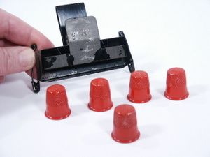 This early and well made in metal device includes 5 metal thimbles with red celluloid paint as issued by P&L. This will hold 4 thimbles under vest or coat until the desired moment for smooth release. This is hallmarked with the early large P&L stamp. Holder has paint absence but functions well. Condition fine. | |