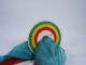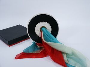 One disc about the size of a 45 rpm phonograph is shown to be blank on both sides. A red silk is threaded through the center hole and as the silk is revolved, the color of the disc changes from black to red. When the silk is removed, both sides are shown to be red. Next a yellow silk is passed through the center hole and both sides of the disc change to yellow. Now a green silk is passed through the center hole of the disc and the two sides of the disc change to green. For a colorful finale, the red, yellow and green silks are threaded together through the center hole and now both sides of the disc change to a rainbow of all three colors!