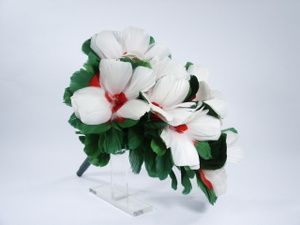 Beautiful high quality feather bouquet that displays as red flowers with green foliage and by simple mechanical operation these red flowers change to white with red centers and a little red outside of the white petals. This can happen as a visual transformation if desired. It is made in the style of Horace Marshall flowers. Condition fine. | |