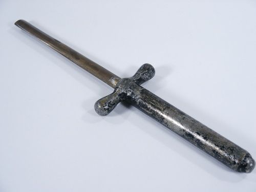 This is a 9 1/2" dagger whereby the blade may be pushed into the handle and gravity fed to make its reappearance. You will not likely see one of these again and is a true antique. Condition good. | |