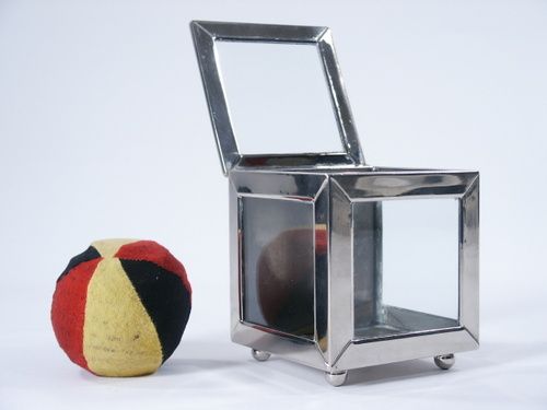 This beautiful nickeled casket measures 3 1/2" wide x 3 1/2" deep x 4" high along with antique cloth covered spring production ball. In as nice a condition as one could hope to acquire. A scarcity.