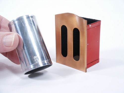 If you want the original and I might add that is difficult to find then here you have a trademark stamped with the Merv Taylor logo unit available to you now. This stands 2 1/2" high and quality made of metal that is painted red and a solid copper open front and finally a polished metal tube which is trademark stamped and a little extra something secret. This is hallmarked with the Merv Taylor Logo and has minor paint absence near edge. Includes instructions. Condition very fine. | |