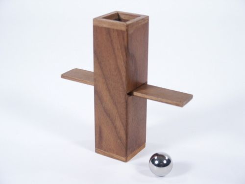 Mr. Miller has been out of production for several years and it is unlikely that items will be made again. Don't miss this opportunity to acquire this handmade item. This is the first one made letter A and signed 2001. Drop-Thru, Clarence Miller, a stainless steel ball is dropped into the top of a square tube which measures 1 3/8" square x 4 3/4" high. The steel ball penetrates a solid wood board and drops to the bottom of the tube. All made in walnut wood and signed by Clarence. Includes instructions. Condition very fine. | |