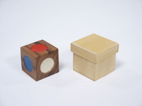 Mr. Miller has been out of production for several years and it is unlikely that items will be made again. Don't miss this opportunity to acquire this handmade item. Color Vision, Clarence Miller, this is a basswood box with walnut cube and Number 3 and 2002 and approximately 1 1/2" having a shallow lid is shown to have a walnut cube within. On the cube are found six different circles of color. A spectator is asked to place the cube in the box with any color of their choosing uppermost and to close the box and hand it to the magician. After some amount of concentration, the magician is able to reveal the correct selected color which is hidden from view! No instructions were ever written for this Miller item. Condition very fine. | |