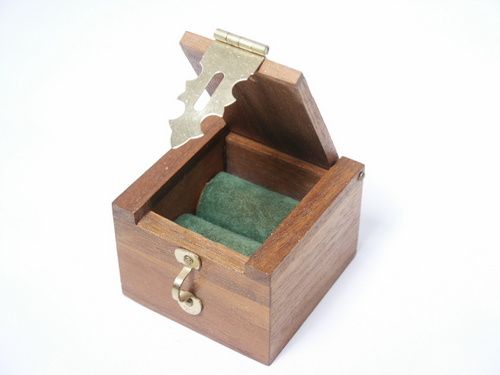 Mr. Miller has been out of production for several years and it is unlikely that items will be made again. Don't miss this opportunity to acquire this handmade item. A Clarence Miller scarcity and this was the first. A walnut box that measures 2 1/16" wide x 2 1/8" deep x 1 1/2" high that may have a finger ring or coin appear within even though it is padlocked shut (padlock not supplied). When the box is unlocked and lid opened the ring or coin is found sitting upright as though you are just opening a box that displayed a ring at the jewelry store. This does not work like a lippincott box but Mr. Miller has incorporated his own style as done with so many other of his items. Condition very fine. | |