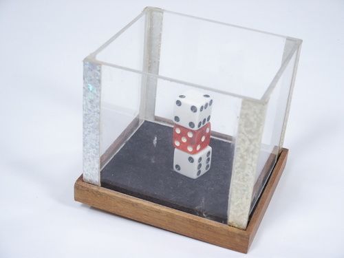 Clarence Miller, the performer exhibits a walnut tray measuring 3 3/4 wide x 3 3/8" deep x 1/2" thick with a removable 3" tall Plexiglas housing. On the tray are seen three dice, two white and one red. The performer states that he will stack the dice with the red one on the bottom and begins to shake the tray. After the dice are seen to move about and the attempt to stack is unsuccessful, the performer says that perhaps the red one must be on top. Again an attempt is made with unsuccessful results. Now he states perhaps the red one should stack in between the white dice and again the desired outcome has failed. Remembering the new miracle medicine for men, he takes from his pocket a pinch of dust from this medicine (imagined) and sprinkles over the dice. At once, the three dice visibly stack with the red die between the two white dice!