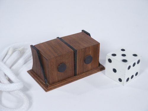Going through the motions of tipping the box down on one end and then the other always showing the high end empty as if the Die has vanished the sucker routine is played out. Finally both doors are lifted up showing the Die has vanished and the box is set aside. Reaching over to the piece of rope that has been seen hanging a few inches outside of the basket or bag he takes hold of it and lifts it straight up and there tied to the end of the rope is the previously vanished Die!