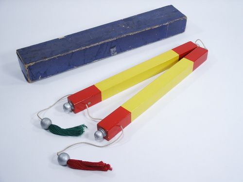 In the original box these measure 13" in length x 1" x 1" and finished in yellow with red trim with one wand having a green tassel and the other a red tassel. The effect is of two square wands shown with a cord running through holes in the end and there is a tassel on each end of the cord similar to the more common known Chinese Sticks effect. These wands are held apart at the top so that when one tassel is pulled the cord between the wands appears to move and naturally as one end of the cord lengthens the other shortens. The magician cuts the piece of cord between the pillars away and then proves they are cut by pulling up each separate tassel by cord from inside of wands. The wands are placed together and again this cord appears to run right through pillars as the pulling of either tassel shortens it on the other side with the cord and tassel always operating in unison. The sucker effect is now introduced by holding the bottom of the wands away from the body in a vertical position and a cord is seen to run across the bottoms. The magician now cuts this away again the pulling of either tassel operates the other in perfect unison the sticks can now be separated and again operated! Includes instructions. Light paint absence of red on edge of wands near bottom overall very good condition. The lid of box reads "Ching Soo Wands" and is absent one small end piece, box worn. Seldom does and opportunity for a scarce variant like this come along. | |