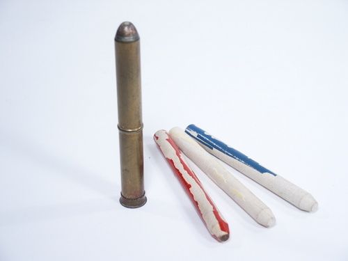 Showing 3 rockets, one in red, one in blue and one in white the magician has a spectator place their choice of one inside the brass case and place on the end cap. Without looking the magician takes the case in hand and is able to correctly tell which color rocket has been placed within. This works perfectly and has condition issue of paint absence from the wood rockets which could easily be refinished and case polished if desired. Includes illustrated instructions. Auctioned as is. | |