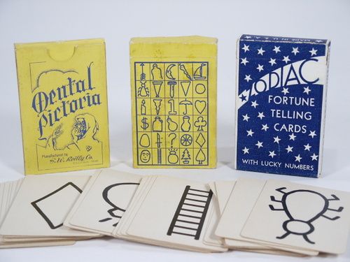 What you have is 2 decks of the Mental Pictoria which enables the following. Performer draws a facsimile of mental pictures with no force, no questions asked and no assistants. No long study needed and may repeated without disclosing the method. A mind reading miracle. The deck consists of 30 picture cards. Includes instructions. The Zodiac Deck uses 30 Astrological cards which makes it easy to tell fortunes without long practice and make admirers where ever you go. Includes instructions. All in very good condition. | |