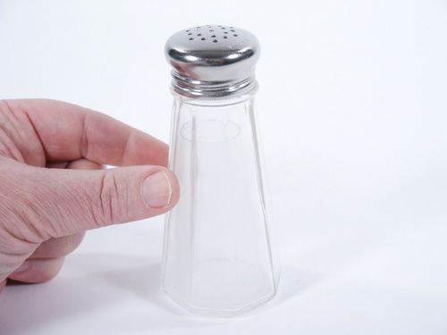 Taking a large salt shaker in hand the magician removes the screw top and drapes a borrowed handkerchief over his loosely closed fist forming a pocket in the center. The shaker is picked up and salt is poured into the pocket until less than 1/3 of salt remains in the shaker. The handkerchief is drawn through the fist, thrown into the air and caught as it flutters down the salt having completely vanished! The original small rubber ball for setting the shaker is absent but a replacement has been made although a little rubber ball would be better that could found in a toy store. A great effect from a great thinker in magic. Condition very fine. | |