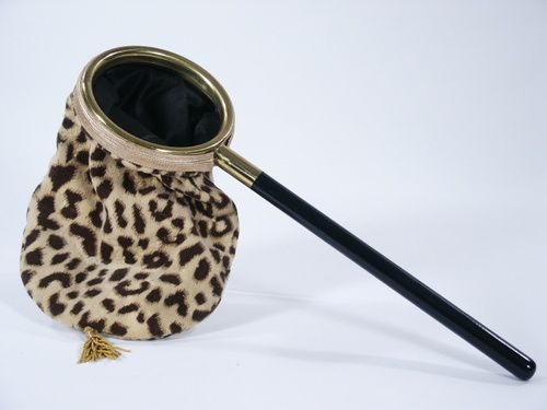 The bag is a leopard print and the handle is of wood. Condition very good.