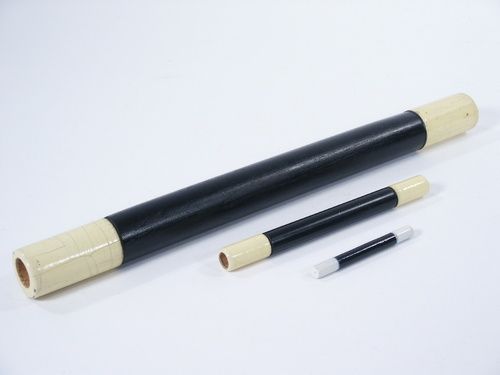 For the wand collector this is an early set all of wood with the largest being nearly 12" long with a 1" diameter and the smallest being 2 1/2" with a 1/4" diameter. Age checkering of white on tips. Condition very good.