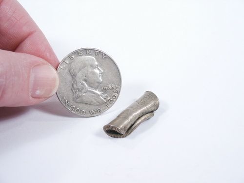 Taking a genuine Silver Franklin Half Dollar and going through the motions of making it appear as though it is flexible (this you do by acting as it is still a solid half) and yet you hand it to a spectator to show it is once more solid. Taking it back into the hands the magician makes several contortions as if really doing something to the half and when the hand is opened it is revealed that the half is now rolled tightly upon its self! These are the props you do the acting. Condition fine. | |