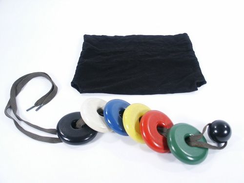 Really fine quality with the 6 disks turned of wood as well as the special ball and well made original special bag used in the effect. The effect is of the magician showing six 3" wooden disks and a black ball and after having been threaded upon the center of a length of cord they are mysteriously removed while the ends of the cord are being held by the spectator. Includes 4 pages of instructions having patter by Herbert Richmond and patter by H. Syril Dusenbery as well. Condition very fine. | |