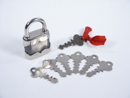 The magician gives for examination a padlock and six keys to a committee of spectators and asks them to try each key in the lock. The committee finds that none of the keys will open the lock. The magician then presents a similar key that does open the lock. This key has a length of ribbon tied to it to distinguish it from the others. They open the padlock themselves and snap it shut through a buttonhole of a spectator's coat. The committee then mixes all of the keys and places them in ordinary envelopes. The magician stands away during all of the proceedings. In fact, he need never touch the lock, keys or envelopes. Yet, while still standing at a distance, he points out the envelope containing the one correct key. The spectators then tear open the envelopes, remove the key and open the lock themselves. Condition very fine.
