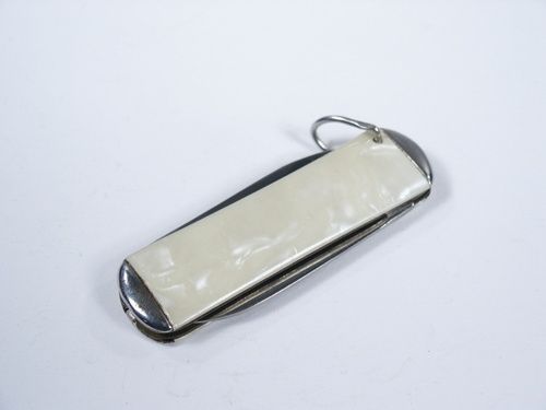 This beautiful pearl finish handle knife is for the performance of having a knife blade visibly put through a borrowed spectators coat which is shown unharmed at conclusion. Includes illustrated instructions. Condition first rate.