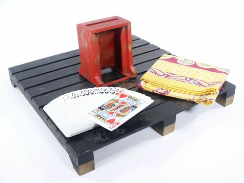 If you wish to present a rising cards effect that is completely baffling as to the actual working then this is for you. A tray composed of slats of wood is shown and a handkerchief is placed over and wood houlette placed in center of tray. The tray is held by performer and can be completely surrounded by audience yet one card after another rises from the houlette. At the finish everything may be handed for examination as this defies detection. Includes instructions. Condition very fine. | |