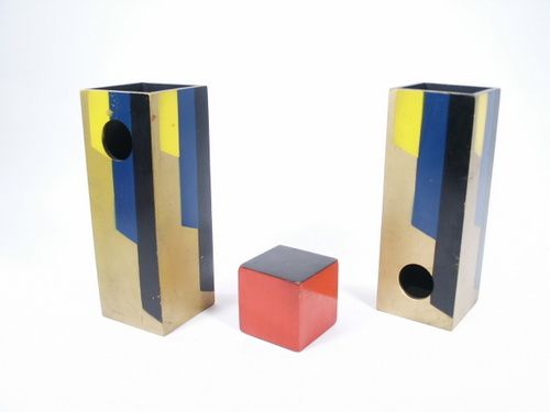 Two decorated wood tubes and a red block of wood 2 3/4" in size for a visible penetration of a plate or whatever item of your choosing (as none furnished). The tubes are stacked with the plate dividing and the red block is dropped in the top of the top tube where it is seen through an opening and it is heard to pass and seen to arrive at the bottom of the lower tube. The inside corner "stops" have patina from age and will need some building up to function correctly. Includes instructions. Condition used. | |