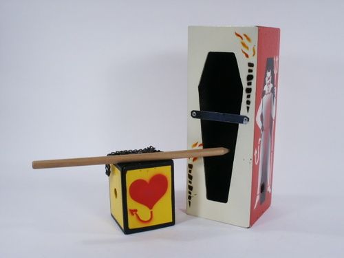 A block with a heart design along with a vampire coffin tube shown. A wood stake locks the block within the coffin yet a chain attached to the block is pulled and the heart visibly penetrates the wood stake! Includes fitted velour bag for carry and instructions. Condition fine.
