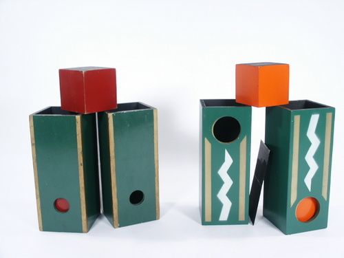 Both include the solid block and special gimmick shell block and one has a sliding metal plate to be in some way used to move over opening as a black art effect which covers one of the openings. Both have glass squares which are still paper wrapped (condition unknown), overall condition good. | |