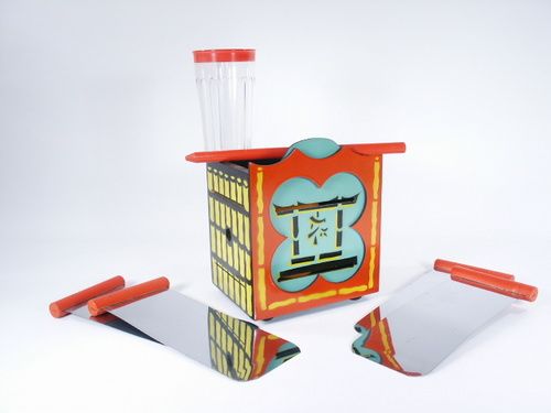 A glass filled with liquid is spilled out showing liquid is indeed real. The glass with liquid is placed inside the chest and four blades are used to intersect along with a wooden rod leaving nowhere for the glass and liquid to be. A removal of four blades and rod happens and reaching in the glass is removed and seen to be intact! Includes instructions. Condition very fine. | |