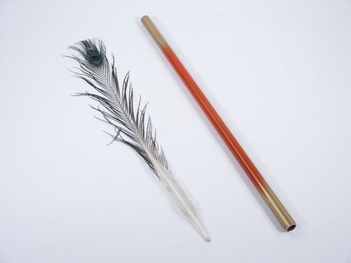 An unusual effect from the 1940's where the magician shows a decorated metal tube and attempts to balance upon his chin in a vertical position. Failing to do this very well he gives a puff of air into one end of the tube and out shoots a single quill feather up into the air where it makes a 180 degree flip and ends as being caught on the magician's palm. Balancing on the palm the quill end of the feather is now placed on the magician's nose and he continues the act of balancing to comedic proportions. Includes instruction. Condition very fine. | |