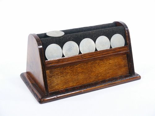 This stand of wood measures 8" wide x 4" high and is equipped on both sides which a ledge for holding coins of which there are 6. The coins are 31 mm smooth sides with reeded edges. From the 1940's, condition fine. | |