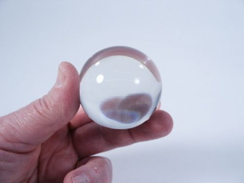 A 2" crystal ball is shown and a card is selected by a spectator unknown to the magician. Holding the crystal up to the spectator's eyes they are asked to gaze within where they see an image of their selected card appear! This early effect comes from Laurie Ireland and includes instructions. Condition very fine. | |