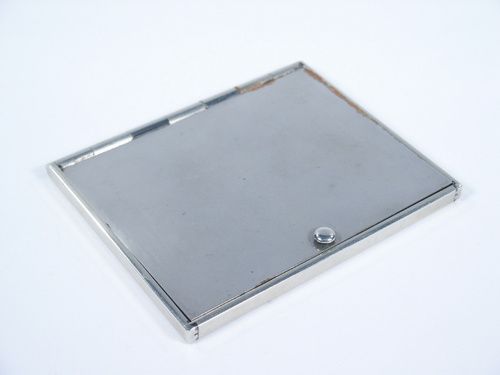 After having a card placed in this box it will change into that of another. With that in mind you will find several applications for use. Minor plating thin, small area near hinge and edge of door. The locking compartment works fine but the door side with handle that the spectator is to open to discover the change is stiff and wants to stay ajar, otherwise good condition and a hard to find item. | |