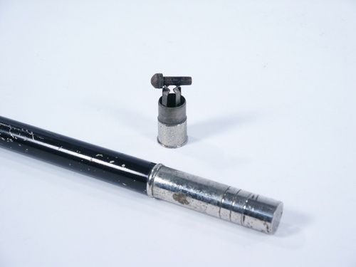 This wand measures 16 1/8" long with a 5/8" diameter and the purpose is for use in vanishing a silk tucked into a rolled cone of paper and with the extra feature being that of having the ability to have the silk reappear in the same cone of paper! This is a difficult item to find and includes instructions. The condition is used with scratches however for the Collector of Trick Wands this one is not an easy acquisition. | |