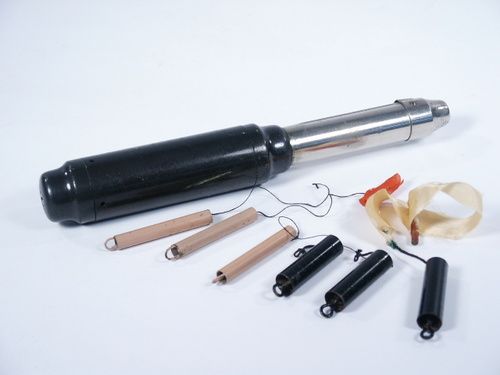 What you have is the gimmick fishing rod handle which allows for delivery of 3 fish and two styles of bait tubes (6 in all) from magician Billy Russell. The silk fish have given away to age and just about non existent. You will need to fashion a pole for the special gimmick handle. Handle condition very good. | |