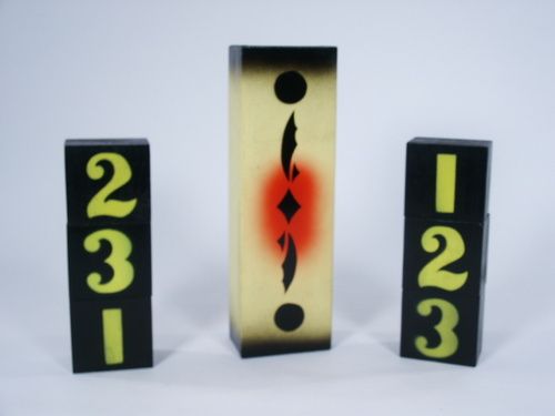 An early Grant effect making use of a decorated cover and 2 sets of numbered blocks all made of wood. After the cover is shown empty the 3 blocks are placed within and the remaining visible blocks are stacked in similar order. After the blocks have been stacked in the same order as those in the cover they are then rearranged to a different order. When the cover is lifted away these blocks are seen to have rearranged to match the visible set! This is done another time or two even with the magician accidentally placing one block in an upside down position and even with one block turned completely around with backside facing audience! Includes instructions. Condition very fine. | |