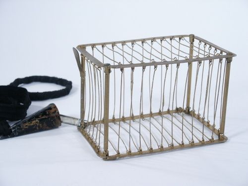A rigid model with sleeve guard and looped for attaching a bird. Cage measures 6 1/4" x 4 3/16" x 4 1/4" high. Condition used.