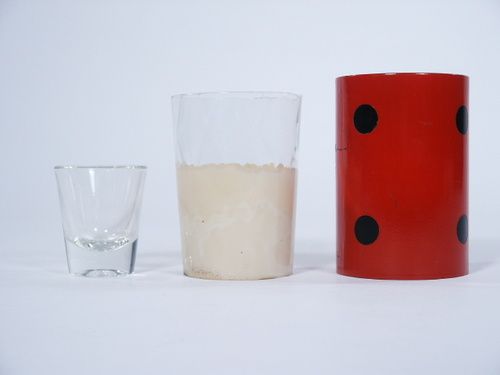 A can is placed on the outstretched hand and performer pours milk into the can remarking that pouring the milk into the can does not condense it. The can is lifted away showing a glass of milk and the can is shown to be nothing but a tube by letting the audience look right through. The can is replaced over the glass of milk and using a little magic the can is lifted away and now seen on the outstretched palm is a little glass with milk! The can is shown empty with the performer making comment about evaporated milk. Includes instructions. Minor paint absence on can. Condition good. | |