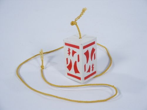 This solid wood block measures 2 1/4" long x 1 1/4" square and is stencil lacquered with Asian design. The block runs freely on cord when held vertical yet upon command of magician will stop along its path and restart again! Includes instructions. Condition very fine.