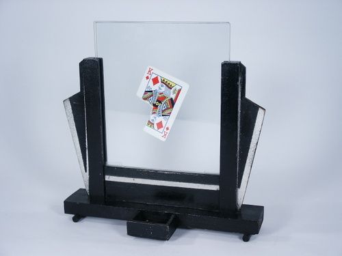 Card torn in pieces with one held back and pieces wrapped in paper and placed in holding box at base of unit. Paper caught fire and in a flash pieces vanish and sandwiched between two panes of glass is the restored card minus one piece! Instructions and flash paper not supplied. Condition very good. | |