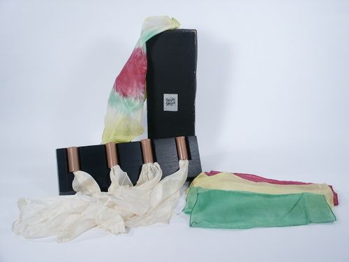 One at a time white silks are placed in a tube of rolled paper and taking a drink of color beverage prior the magician blows the white silk out of the tube high into the air where it is seen to have changed into the color of the beverage sipped upon. This continues to the finale of a multi color silk. This includes the proper instructions and special gimmicks for accomplishing this very pretty and magical effect. Silks are older and once you practice a while you will want to refurbish with new silks. Condition good. | |