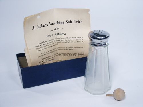 With this you are able to take a large shaker and pour a good quantity of salt into a handkerchief and have it completely vanish! Includes instructions. Condition metal top has dent all in good used.