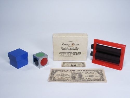 The money maker is a good gag to carry in your pocket to print money for a tip. Box light soil. Money Maker with light glue residue from manufacture. Includes instructions. Color Vision, early one made with wood block and metal color spots. Condition good. Includes instructions.