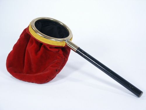 If you need one to perform with then you cannot argue with the quality of one of these as it is made in metal of brass and using the finest of red velour for the bag. This is hallmark stamped with the P&L logo. Condition paint absence to handle and light soil to bag otherwise very fine.