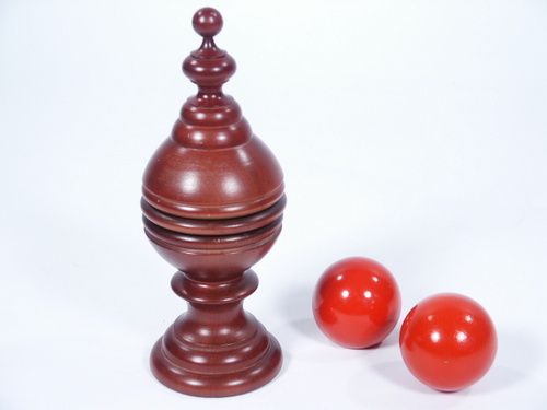 This very special vase that stands 6 3/8” high enables the magician much more than the standard ball and vase effect. Not only is the ball migratory in its behavior but it also makes transposition with a silk which ends in a surprise finish! Includes illustrated instructions. Silk not supplied. Condition very fine.