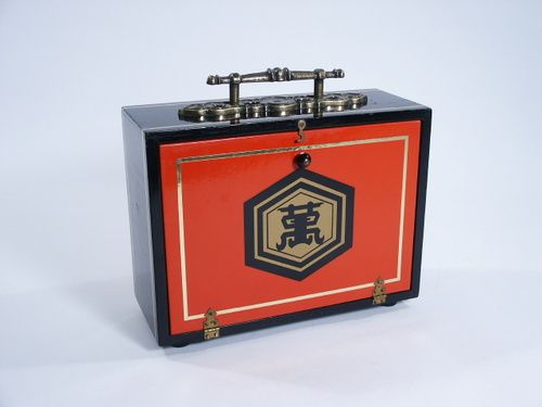 The cabinet is shown empty by lowering the front and back doors and a ball is placed in one side of the cabinet and an empty glass in the other. The doors are closed and on reopening the ball is found to be inside the glass! Includes instructions. Rubber ball replaced with sponge ball by previous owner. Condition one hinge on bottom section has had brads installed in place of original screws and not very well. Overall good condition.