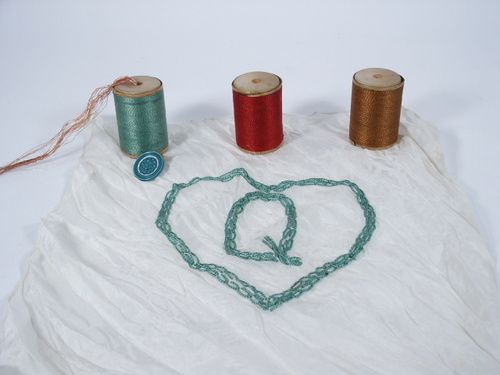 A white silk and three different color spools of thread are shown. A spool selected and silk rolled around and held with rubber band. Spool is strung on a cord with a button on one end to keep spool from coming off and in this condition is lowered into a paper bag. The cord is left hanging on the outside of the bag and all is given to a spectator to hold. A card is selected from a pack and on removing the spool with silk from the bag, the thread is found to have vanished from the spool and on opening out the silk the name of the selected card is found sewn right across its center in the very color thread that was chosen! Blank silk is absent. Includes instructions and a difficult item to find. Condition good.