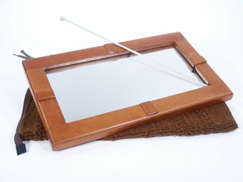 This is a handsome unit in natural finish solid mahogany wood and a beautiful effect in magic. Mirror first placed in knitted zipper bag and needle pushed right through, penetrating mirror in various places! After this is done the magician proceeds to bend the mirror in half and then straightens it out removing it from the bag intact! Includes instructions. Condition very fine.