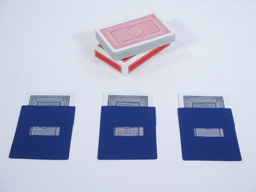 Three vinyl sleeves are shown to have one blue playing card within and placed before a spectator. The faces and backs of a red deck of cards is shown and with the cards face up one is chosen by the spectator. The spectator also selects one of the three vinyl sleeves and the red card that was also selected is removed from the deck by the performer and placed in the selected vinyl sleeve. The performer picks up the sleeve and asks the spectator to remove the red and blue card and both cards bear identical faces! The other sleeves are turned over and seen to contain different cards than the sleeve that was chosen by the spectator. Includes instructions. Condition unused, very fine.